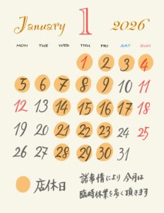 12月は24日水曜日まで営業いたします。25日木曜日からお休みを頂き、年始の営業開始は1月9日金曜日を予定しております。